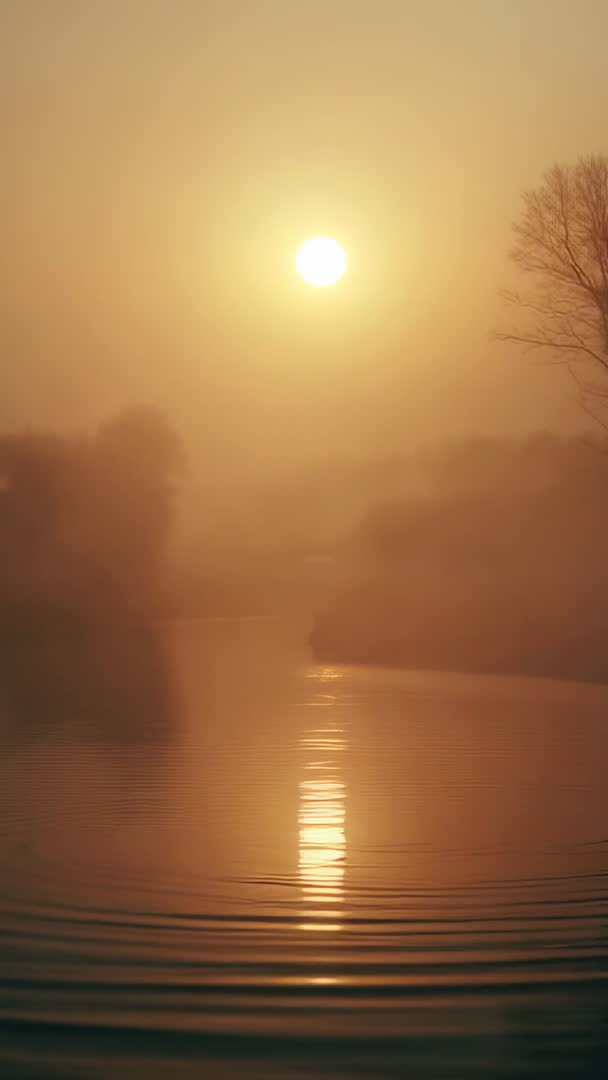 AI Generated Image. Vertical video capturing glowing sun rising above misty river, casting long vertical reflection across calm rippled water. Fog is thinning, revealing soft silhouettes of shoreline and bare tree. Warm amber light is bathing scene, creating tranquil cinematic atmosphere and subtle mirror highlight on water surface. Gentle ripples are adding rhythmic foreground texture and depth. Serving as cinematic B-roll for nature documentary openings and travel promotions. Working well as background for meditation and relaxation videos, wellness app intros, spa and retreat advertising, and ambient social media reels and stories. Fitting hero banner for website or mobile wallpaper with room for text overlay and logo. Recommending slow pan or gentle zoom during edit, pairing with soft ambient music and warm color grade to enhance mood and audience engagement.