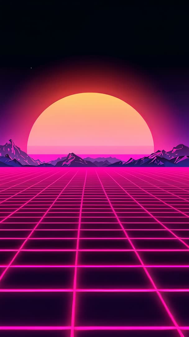 AI Generated Video. Looping vertical video featuring glowing sun filling horizon while neon magenta grid stretching toward jagged mountain silhouettes. Color palette combining deep purples, hot pinks, warm oranges creating retro 80s synthwave atmosphere. Visual elements including pulsing glow, horizon orb, reflective grid lines, and stylized peaks offering strong geometric perspective. Ideal for smartphone wallpaper loops, social media reels, music visualizers, DJ and VJ backdrops, livestream overlays, gaming stream backgrounds, and retro product promos. Seamless looping enabling continuous playback for ambient background during events or presentations. Fitting for branding projects needing nostalgic futuristic vibe, EDM promotions, synthwave playlists, and motion design templates with easy color grading and tempo adjustment.