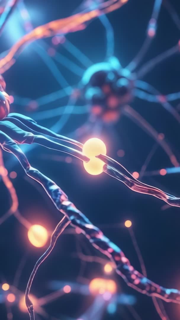 AI Generated Image. Vertical 9:16 animation showing glowing synapses transmitting particles across synaptic gaps. Color palette combining deep blues with warm neon oranges for high contrast and cinematic look. Useful for tech presentations, neuroscience education, AI demos, mobile ads, social media stories, website hero banners and app intros. Looping motion graphics working as ambient background, title sequence, event visuals or trade show display. Available in 4K vertical and 1080x1920 formats, optimized for mobile and social platforms. Editing suggestions: adjust color grade, apply slow motion, add sound design with soft synth pads and subtle percussive pulses to enhance immersive feel. Licensing friendly for commercial use, scientific publications and educational materials.