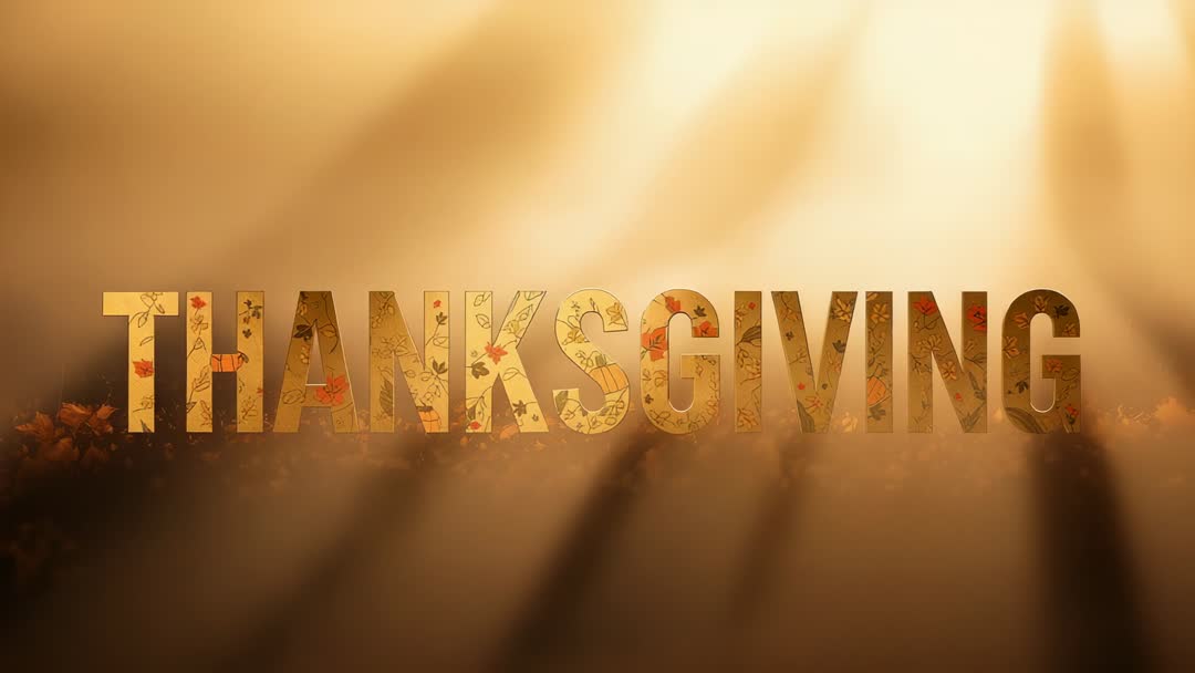 AI Generated Image. Scene showing glowing THANKSGIVING letters casting long golden rays across hazy autumn field. Letter surfaces featuring delicate floral and leaf patterns, reflecting warm amber light and creating cinematic depth. Composition including soft bokeh foreground and dramatic shadows stretching toward viewer. Visual mood conveying warmth, gratitude, and festive quiet. Use for holiday video opener, seasonal website hero, social media campaign, TV commercial, virtual event intro, restaurant menu background, e-card animation, store window display. Allowing text overlay and logo placeholders for branding. Color grading and music adding emotional warmth. Delivering versatile clip for looping backgrounds, title sequences, and promotional spots.