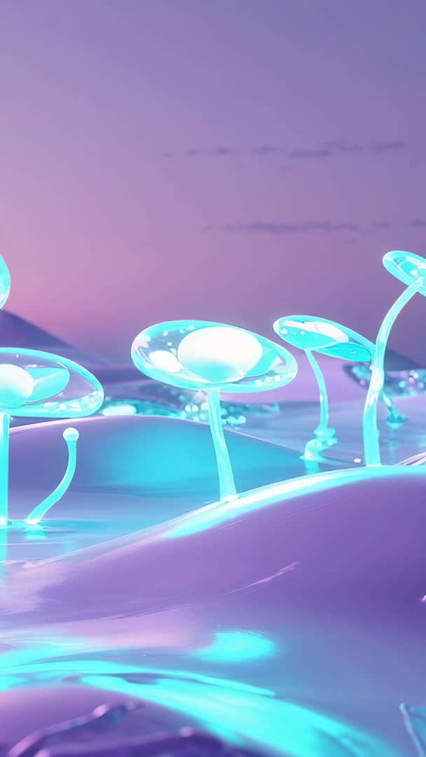 AI Generated Image. Featuring translucent mushroom stalks glowing with cyan light, pulsing rhythmically across glossy lavender hills. Vertical 9:16 video loop capturing minimalist, surreal landscape with reflective surfaces and soft pastel gradient sky. Cinematic shallow depth allowing foreground detail to pop while background fades into dreamy haze. Ideal for use as social media reels, app or lock-screen backgrounds, music visualizers, brand intros, meditation and wellness promos, futuristic product showcases, film and game concept reels, live VJ performances, and website hero banners. Color palette blending cyan, teal, lavender, and soft magenta creating calming yet otherworldly atmosphere. Loop-friendly motion enabling seamless repetition for animated backgrounds, stage visuals, and installations. Available in high resolution for digital campaigns, motion graphics projects, and immersive displays.