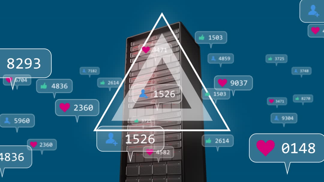 Abstract depiction of a glowing triangle intertwined with digital social media icons like likes and notifications against a server backdrop. This illustration conveys themes of global connectivity, networking, and technological interfaces, and is perfect for use in projects related to social media marketing, digital communications, or server technology.