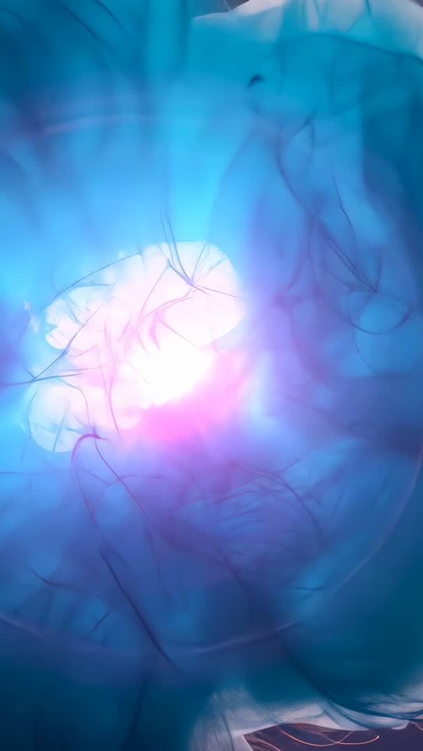 AI Generated Video. Vertical clip showing glowing turquoise LED cloud with magenta core and delicate drifting fibers, backlit to create soft halo and misty atmosphere. Close-up composition emphasizing translucent strands and dynamic color gradients between blue and magenta. Ambient motion and gentle light bleed creating hypnotic, ethereal visual ideal for modern creative projects. Usage ideas: background for music videos, DJ visuals, VJ loops, social media stories and reels, vertical ads and promos, phone wallpaper and lock screens, website hero sections, meditation and wellness app visuals, tech and science presentations. Editing suggestions: looping for seamless playback, speed ramping for dramatic reveals, color grading to match brand palette, adding subtle particle overlays or ambient sound for immersive experience. Licensing notes: suitable for commercial and editorial projects requiring abstract light textures and atmospheric motion.