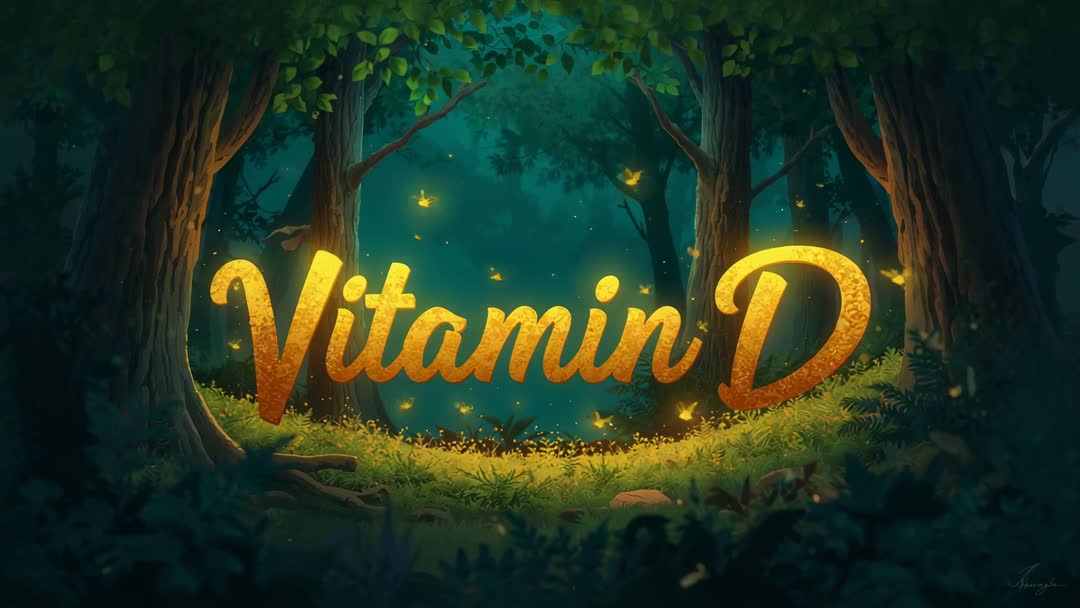 - Glowing Vitamin D Text Illuminating Magical Forest Clearing with Fireflies Rising