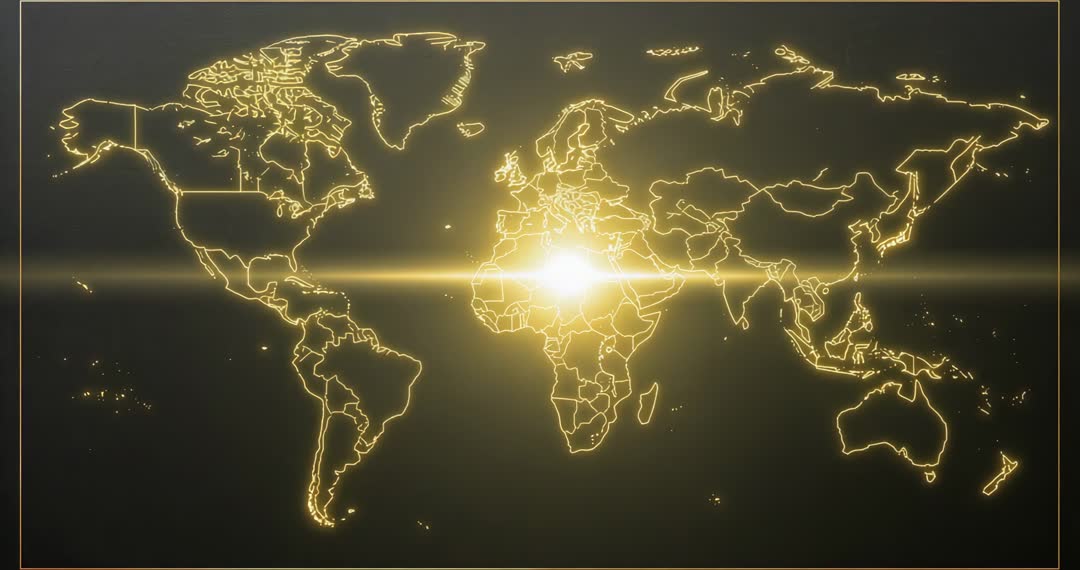 AI Generated Image. A pulsating digital world map shines with glowing gold borders against a dark background, showcasing continents with modern lens flare effects. Captures elements of futurism and technology, ideal for presentations, digital projects, or educational content on global geography and emerging tech. Perfect for use in videos featuring travel content, tech showcases, or cosmopolitan themes.
