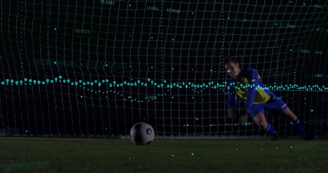 This scene captures a male goalkeeper diving to stop a soccer ball with overlay lines and numeric indicators demonstrating motion tracking for performance enhancement. Ideal for use in sports technology advertising, athletic performance monitoring systems, and digital sports analysis platforms, this portraying technology at play vividly illustrates the fusion of athleticism and data analytics.