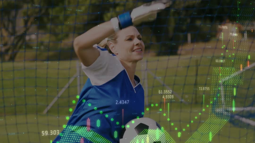 Dynamic footage combines athletic goalkeeping with digital sports analytics overlay. Ideal for sports technology promotions, analytical strategy tools, and competitive soccer game analysis.