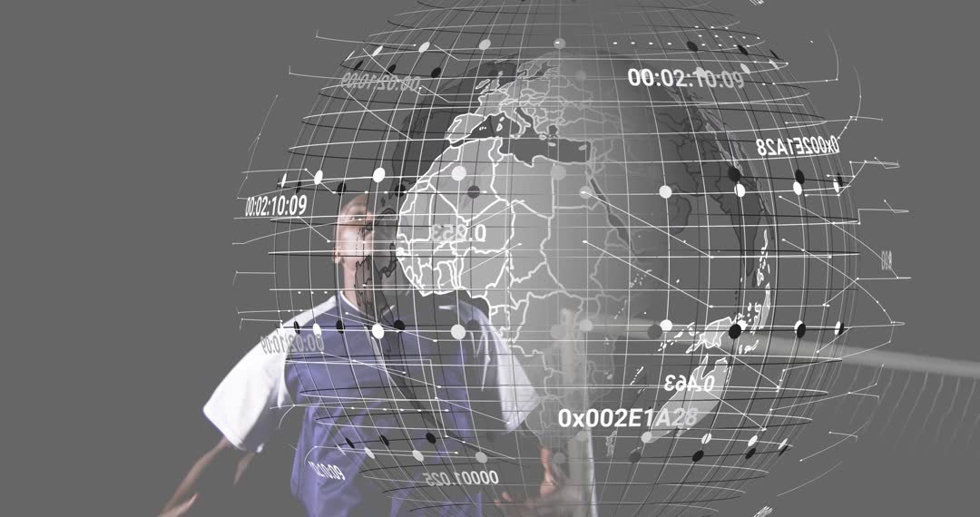 Depiction of a goalkeeper standing poised under a goalpost with a globe overlay displaying match analytics. Perfect footage to demonstrate advanced technology in sports analytics, innovation in athletic tracking, and the integration of data visualization in soccer. Useful for sports technology advertisements, innovation showcases, or educational presentations on digital solutions in athletics.