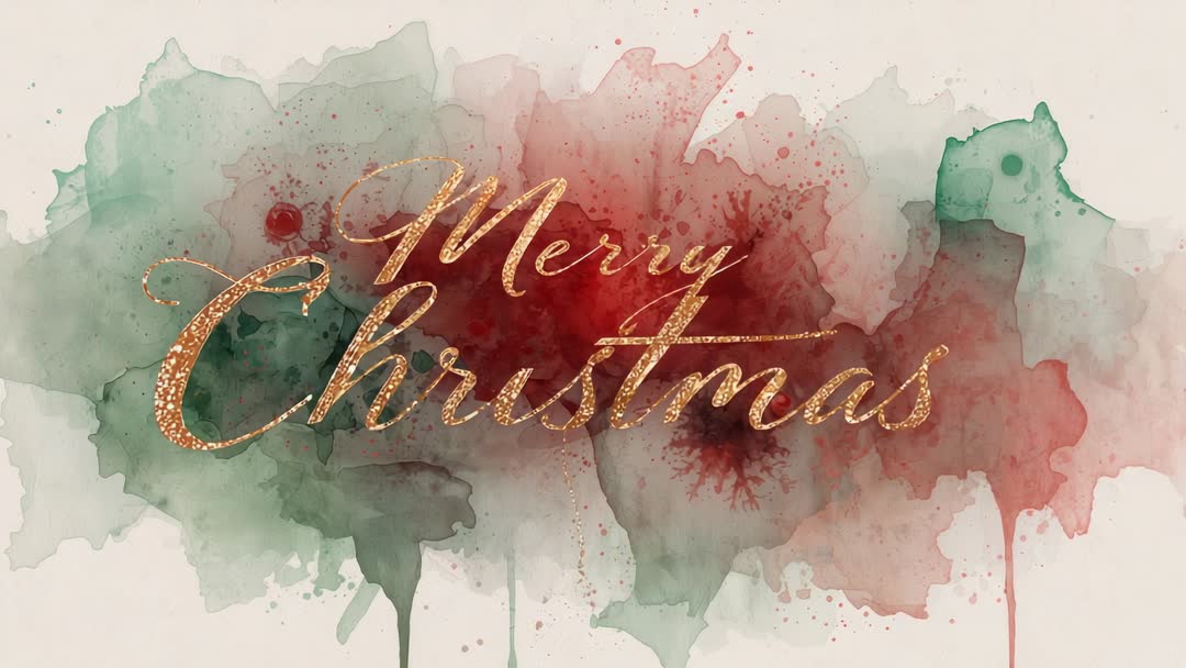 AI Generated Image. Loopable watercolor reveal video featuring gold cursive Merry Christmas emerging from red and green ink washes on creamy textured paper. Gold lettering glittering and catching light while watercolor splashes flowing, blending, dripping into soft gradients. Clip working well for holiday campaigns, social media stories, email headers, website banners, e-card intros, in-store screens, and video ads. Use suggestions: overlaying brand logo over final frame, adding festive music track, pairing with product shots for seasonal promotion, or using freeze-frame stills for printed card mockups and website hero art. AI generated texture delivering high-resolution detail for close-up crops and motion design work.