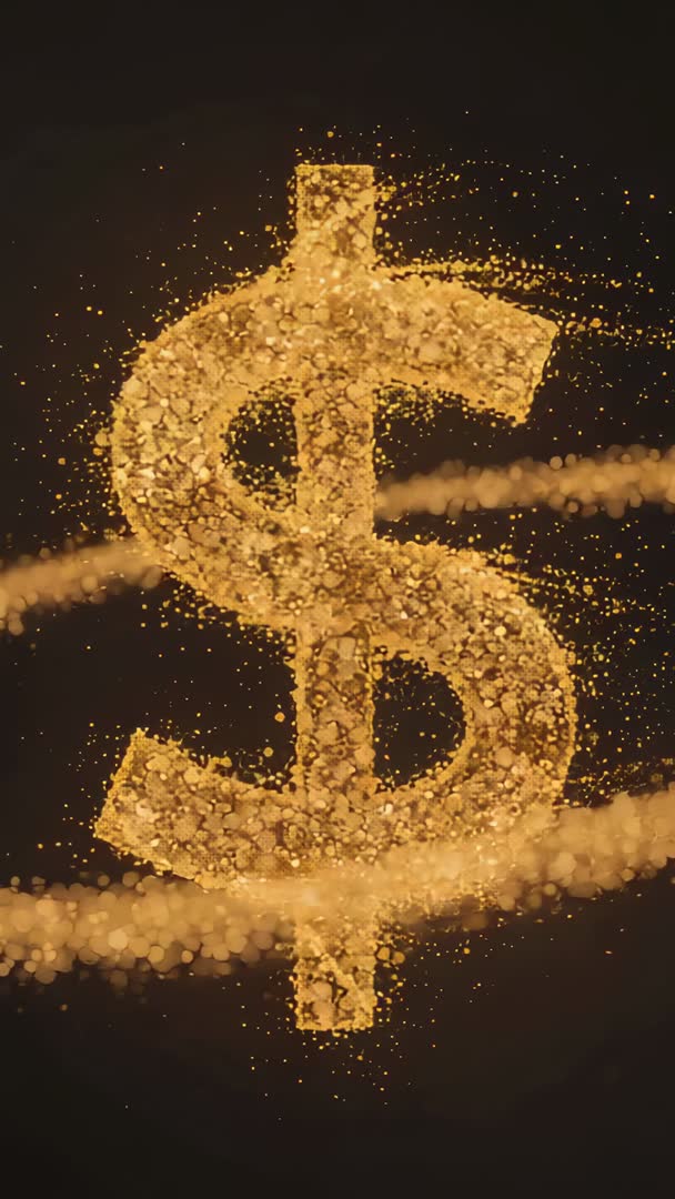 AI Generated Video. Showing glowing dollar sign formed from gold dust and glitter, particles swirling in orbit and ring beams sweeping across scene. Delivering cinematic depth and warm gold tones for high-end finance, wealth management, investment and luxury brand campaigns. Working as vertical loop for social media reels, mobile ads, digital signage, broadcast bumpers and website hero backgrounds. Allowing text overlays and logo reveals with clean negative space around emblem for branding and call-to-action placement. Supplying 4K-friendly cinematic footage for commercials, presentations, pitch decks and promotional content seeking premium visual impact.
