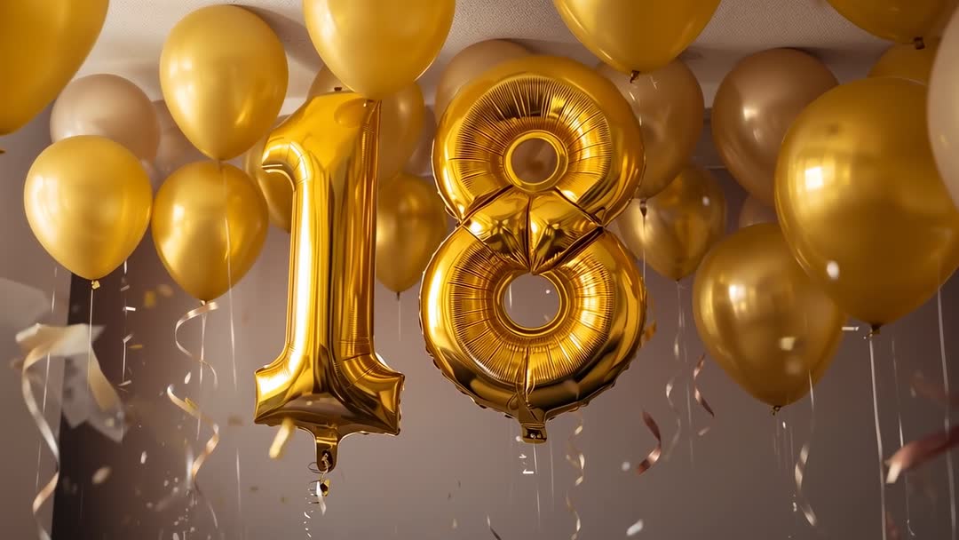AI Generated Image. Showing oversized gold foil '18' number balloons floating amid cluster of metallic balloons, confetti falling, ribbons drifting across frame. Warm golden lighting reflecting off balloon surfaces, creating elegant festive mood. Slow camera movement and soft focus creating cinematic atmosphere and seamless loop potential. Useful for 18th birthday promotions, milestone celebration invitations, social media reels, event announcement videos, party venue signage, e-card intros, retail display loops. Production tips: trim clip for short social formats, add upbeat music and animated title overlay, apply color grading for richer gold tones, export as loopable MP4 or MOV. Licensing-friendly clip for commercial campaigns, lifestyle blogs, birthday party content, and event planning portfolios.