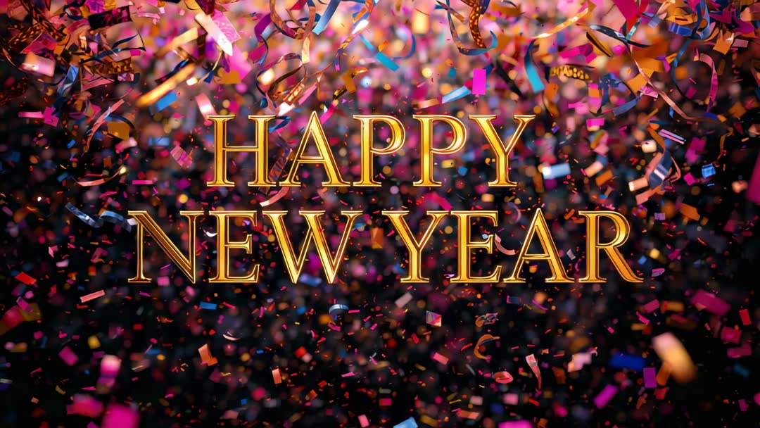 AI Generated Image. Showing gold HAPPY NEW YEAR serif text framed by falling confetti, colorful ribbons, and glitter bokeh on dark stage. Featuring cinematic depth, vibrant gold highlights, and lively motion ideal for countdowns and celebration reveals. Working as looping animation for social media intros, digital signage, website hero banners, event openers, and holiday ads. Leaving center space for overlaying logo, custom headline, or date. Delivering high energy, festive mood, and premium look for corporate parties, retail New Year sales, greetings, and broadcast intros. Providing easy color grading and cropping for vertical, square, and widescreen formats.