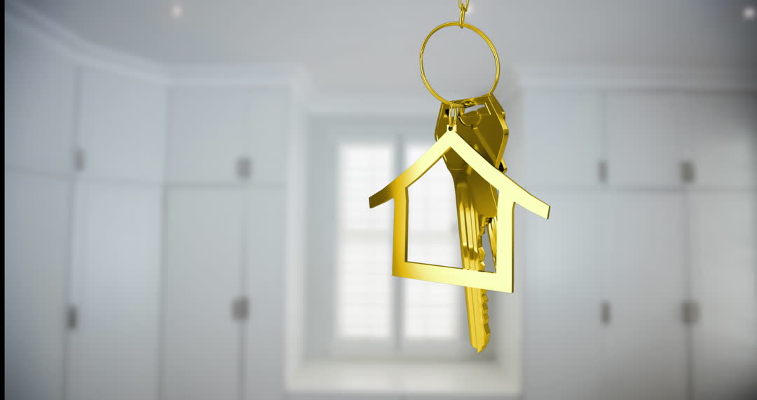 A gold house key fob and accompanying key are hanging prominently against a soft, blurred background of a house, suggesting movement or emphasis on the key. This can represent the concept of purchasing a new home, real estate opportunities, or investment potential. Ideal for marketing materials in the housing and real estate industry, informational brochures about home buying, or as a symbol of unlocking new property possibilities.