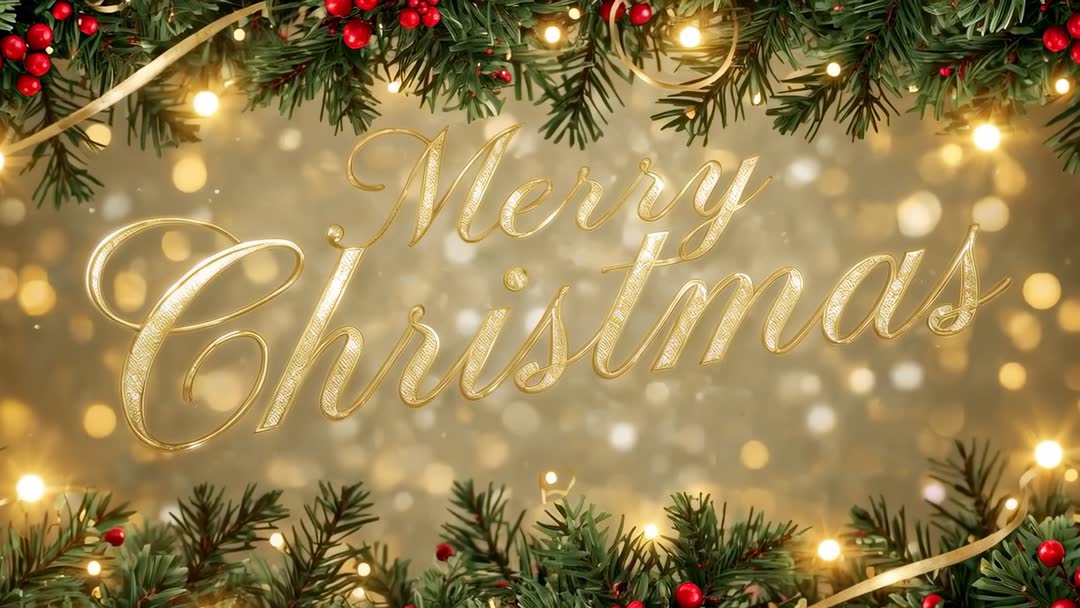 AI Generated Image. Featuring gold script Merry Christmas text glowing over soft gold bokeh backdrop, framed by lush pine garlands, red holly berries, gold ribbon and warm fairy lights. Presenting elegant motion with subtle sparkles and gentle glow, creating festive, luxurious atmosphere. Seamless looping animation offering flexible duration for intro or background playback. Suiting holiday card openers, social media posts, website header banners, email campaign headers, retail display screens, event invitations and digital signage. Allowing easy logo or custom message overlay in center space. Supplying polished, high-end visual for brands and creatives seeking classic holiday look with modern animated polish.