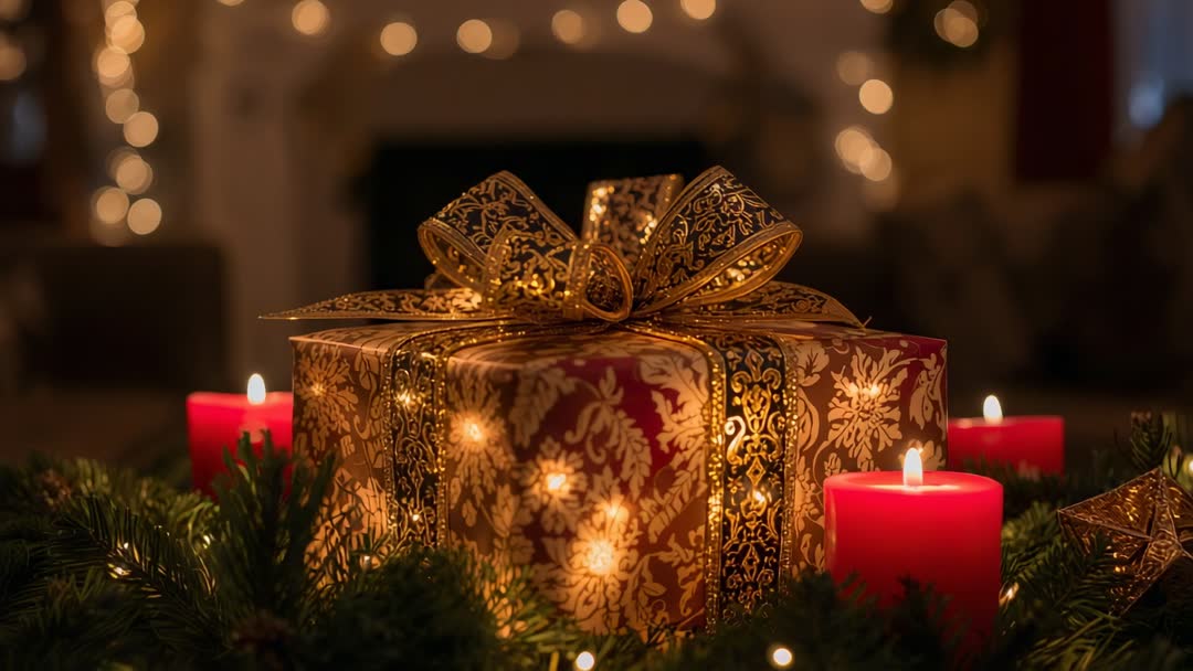 AI Generated Image. Close-up video clip showing gold ribboned red gift box glowing on mantel garland, candles flickering, bokeh lights twinkling in background. Warm golden tones and intricate ribbon patterning creating luxurious festive mood while soft candlelight adding intimate feel. Useful for holiday marketing, seasonal social media posts, ecommerce banners, greeting card animations, gift guide videos, blog headers, email campaigns, in-store digital signage, event invitations. Working well as looping short clip for Instagram Reels, Facebook ads, website hero banner, or digital signage; leaving negative space in upper right for text overlay or logo. Ideal for storytelling around gift giving, family gatherings, romantic holiday scenes, luxury product promotions, or DIY wrapping tutorials.