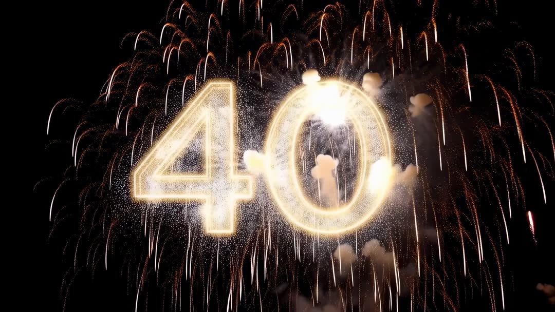 AI Generated Image. Showing golden numeral 40 formed by bursting fireworks, producing falling embers, glowing halo, and drifting smoke against black sky. Long exposure trails creating streaks while fine particles adding glitter effect and bright center flares producing lens bloom. Background remaining deep black for high contrast and dramatic impact. Working well for anniversary celebrations, corporate milestone reels, birthday countdowns, event openers, promotional spots, and social media clips. Providing loop-friendly ending for seamless playback, making ready-to-edit clip for motion graphics projects. Pairing easily with upbeat music, bold typography overlays, logo reveal, date and name overlays. Recommending color grading toward warmer gold tones and subtle vignette for cinematic look. Offering wide framing for safe title placement and cropping flexibility for vertical or square formats. Delivering high visual energy for marketing campaigns, in-store displays, invitation animations, live event intros, and online ads. Including AI-generated tag for licensing clarity and usage notes.