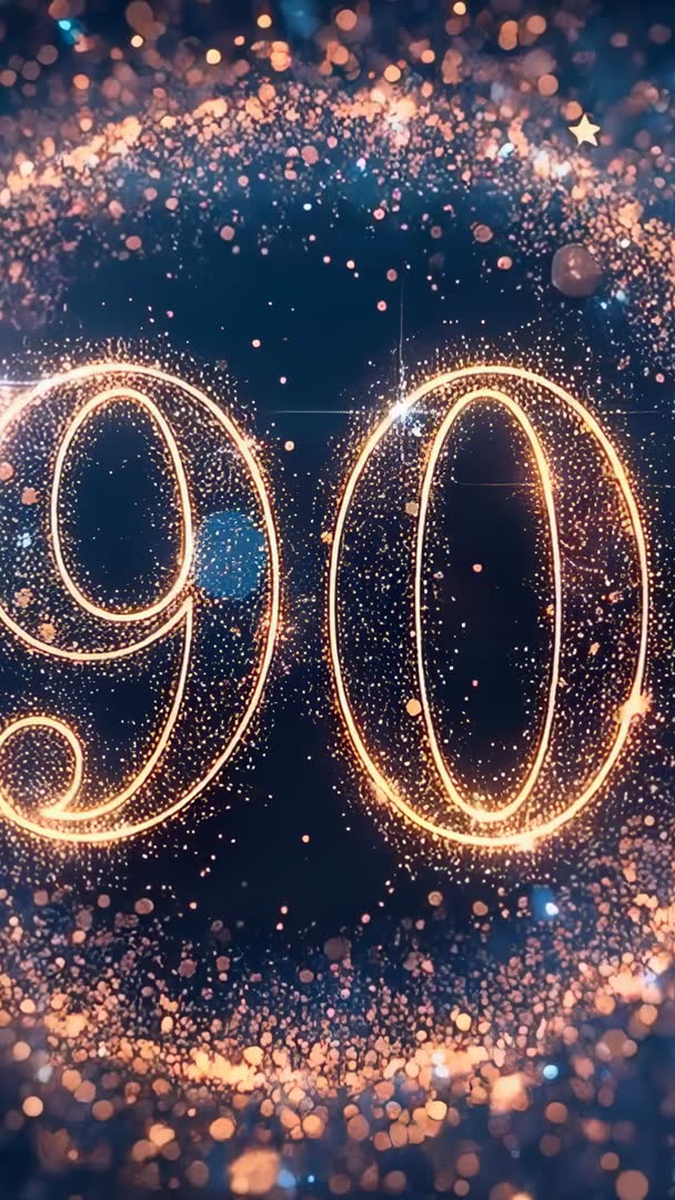 AI Generated Video. Video showing glowing golden numeral 90 formed from swirling sparkling particles on deep navy background. Ring of glitter and bokeh particles circulating around digits, creating cinematic halo, shimmer and festive atmosphere. Designed for celebrating 90th anniversary, 90th birthday, corporate milestone, retirement tribute, gala opener, anniversary campaign, social media vertical ad, Instagram story and TikTok promotion. Providing loopable animation, customizable color grading and overlay-ready space for adding text, logo, countdown or voiceover. Delivering elegant, luxurious mood for event intros, invitation reels, broadcast graphics and celebratory promos.