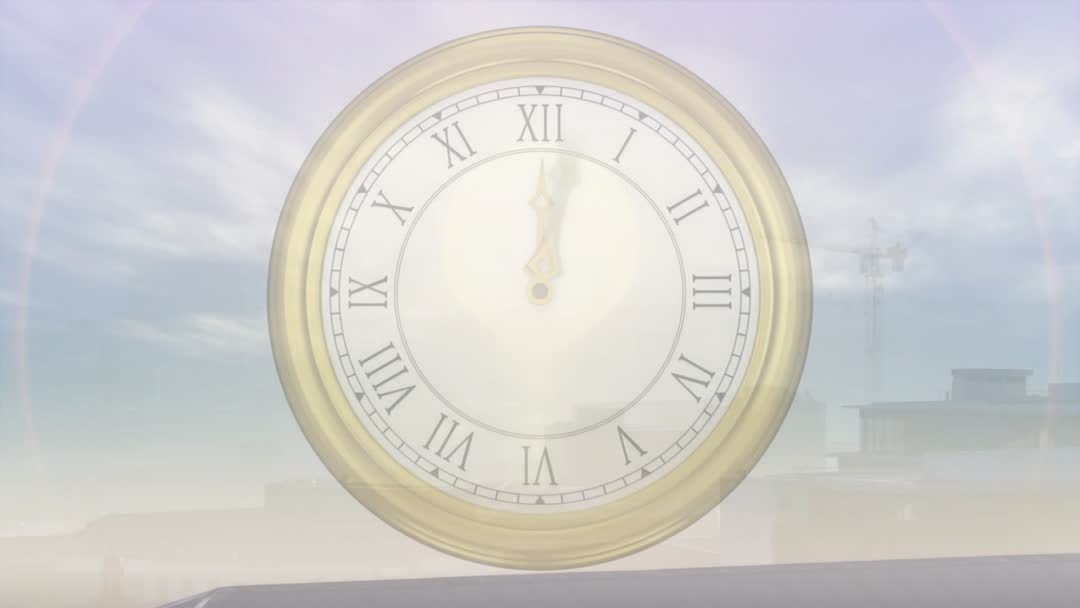 Scene captures a floating, antique-style golden analog clock set against an urban skyline with soft, transitioning day-to-night skies. Emphasizes concept of time passing and transition. Dramatic visuals highlight celestial and environmental interplay. Ideal for conveying themes of time, change, future, or historical narratives in video projects related to urban living or time-related content.