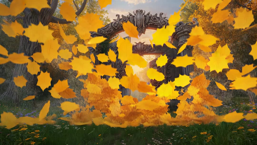 - Golden Autumn Leaves in Motion Through Enchanted Forest Gate