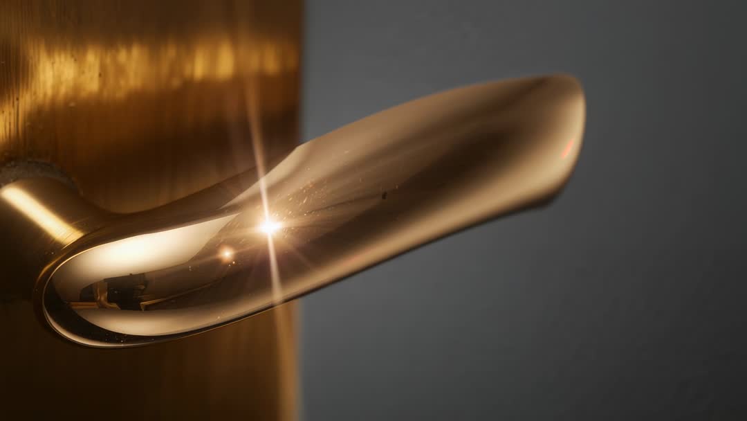 AI Generated Image. Closeup clip showing polished brass door lever catching bright star flare and soft reflections along curved surface. Warm golden tones and deep contrast creating elegant, high-end mood for luxury hardware promotion. Clip working well as hero video for product pages, showroom reels, interior design promos, architectural visualization, and commercial spot openers. Ideal for slow-motion loops, logo reveals, lower-third transitions, and background footage behind text overlays. Recommend mild color grading to enhance warm highlights, subtle vignette for focus, and soft ambient audio bed for final edit. Suitable for horizontal video, can be cropped for social square or vertical formats, and pairs well with minimalist type and clean motion graphics for premium branding.