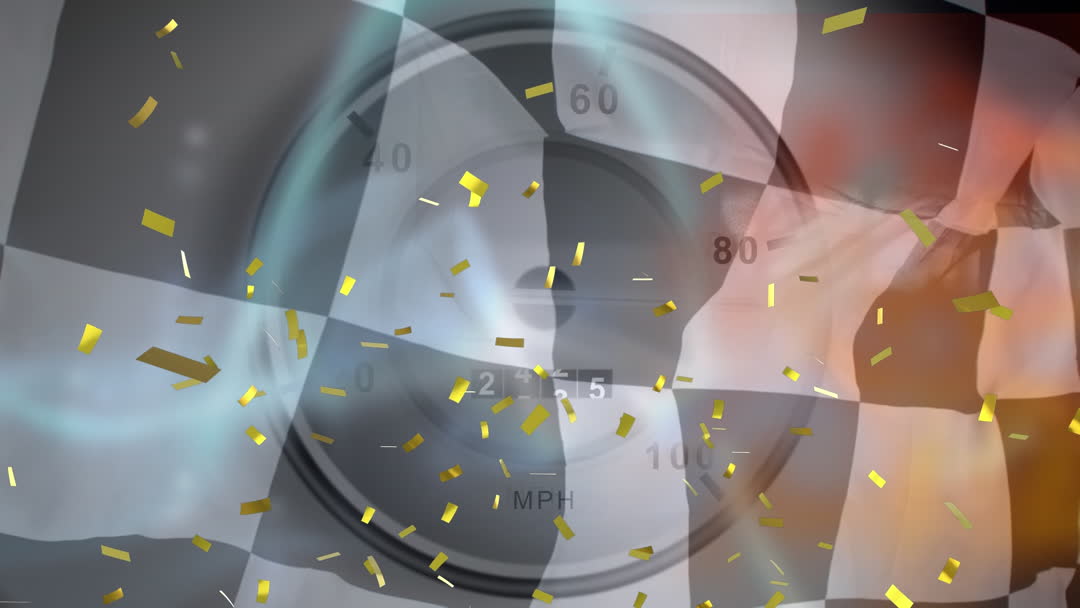 - Golden Confetti Falling Over Speedometer and Checkered Flag
