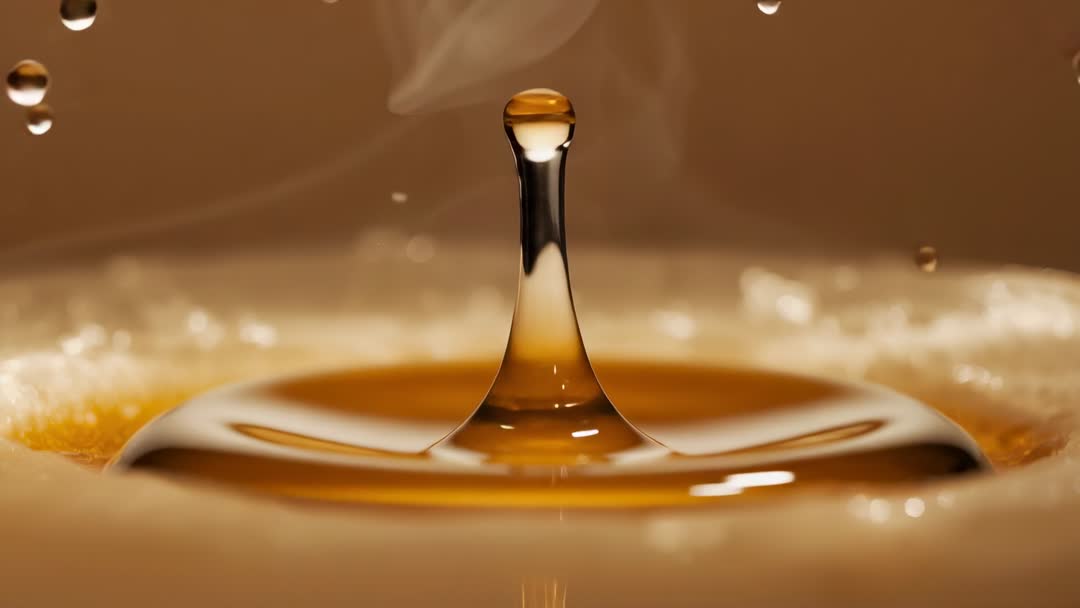 AI Generated Image. Short slow-motion clip showing spherical droplet striking shallow amber pool, creating crown splash and slender jet topped by secondary droplet. Macro closeup capturing smooth reflection, warm brown tones, and delicate surface tension details. Footage suiting product campaigns for beverages, oils, and beauty liquids, scientific content on fluid dynamics, and abstract motion backgrounds for websites and social channels. Clip working well as hero footage for landing pages, texture overlay for motion design, or looping visual for retail displays and presentations. Color grading and slow-motion timing allowing easy integration into brand videos, commercials, and multimedia projects.