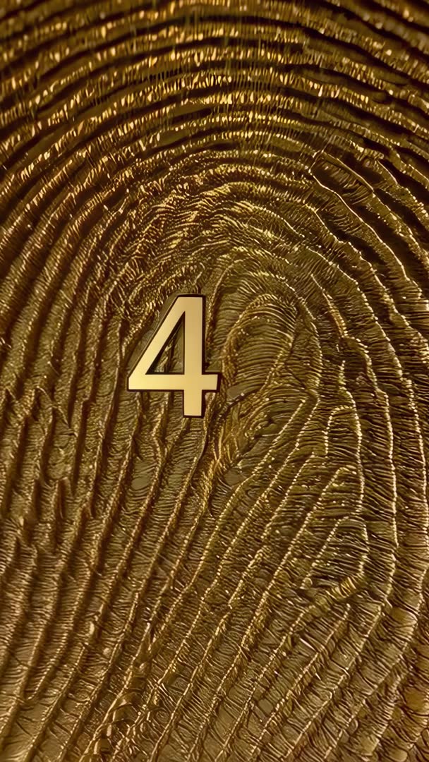 AI Generated Image. Vertical macro clip showing gold metallic fingerprint with bold number 4 overlay, featuring slow zoom and subtle lateral shift, bright glints sliding across ridged surface. Textured ridges and micro details creating tactile, high-contrast visual that is working well for title sequences and animated intros. Clip is looping friendly, offering seamless repeat for motion backgrounds. Use for luxury branding, security or identity concept visuals, forensic or tech themed presentations, app intros, social media vertical ads, and music visualizers. Color grading and speed adjustments are working well to match brand tone and pacing. Crop-friendly for mobile formats and usable as dramatic backdrop for text or logo overlays.