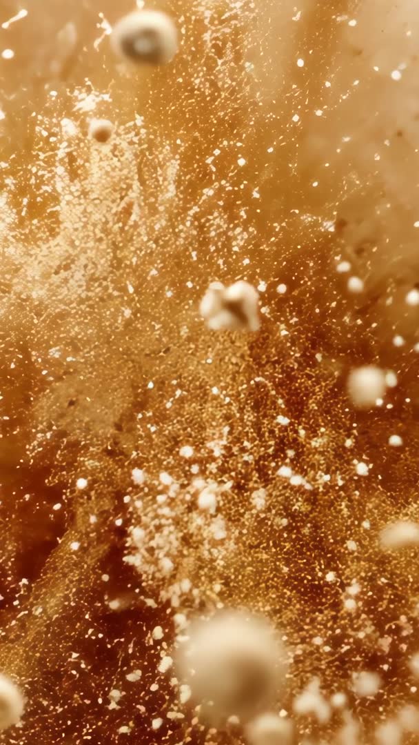 - Golden granule suspension with white beads swirling into light foam | Vertical macro motion loop