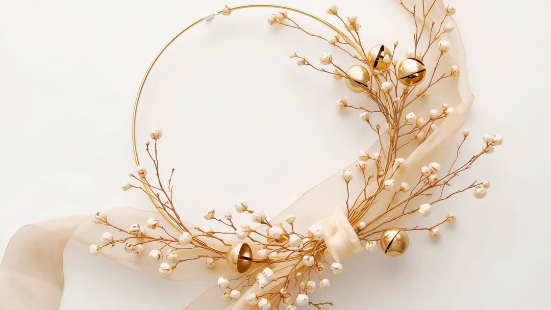 AI Generated Image. Featuring minimalist golden hoop wreath adorned with delicate cream buds, sheer ribbon, and jingling gold bells, gently swaying against soft neutral background. Composed for graceful negative space on left side, enabling text overlay and logo placement. Captured as seamless loop suitable for holiday openers, website hero banners, social media reels, email headers, and seasonal marketing. Working well for seasonal product display, packaging reveal, wedding announcement, boutique branding, and craft tutorials. Offering calm, elegant mood for luxury, minimal, and slow-living campaigns. Including suggestions for warm color grading, adding subtle text animation, pairing with piano or ambient soundtrack to enhance festive yet refined atmosphere. Delivering high-resolution frame for still extraction and motion graphics, and providing versatile asset for commercial and editorial use.