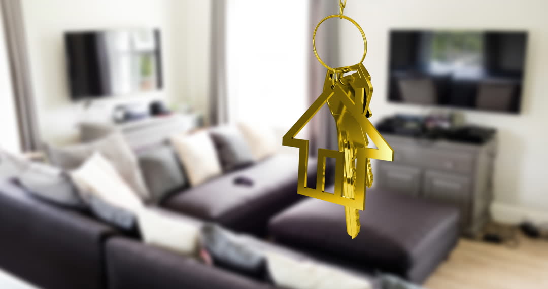 - Golden House Key in Modern Living Room Symbolizing Home Ownership