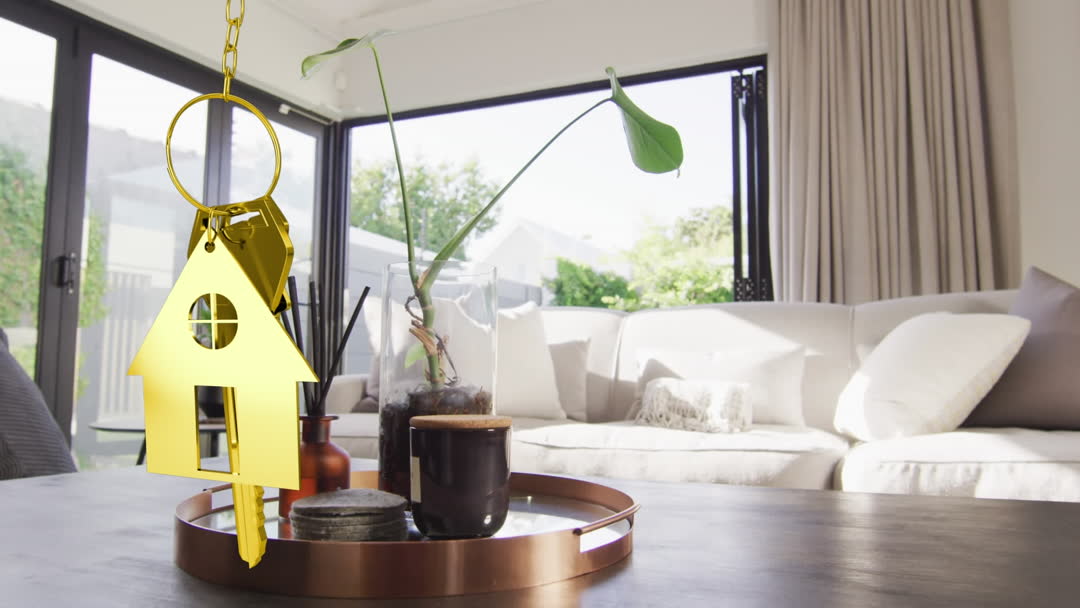 Golden House Key Symbolizing Moving in Modern Living Room Video