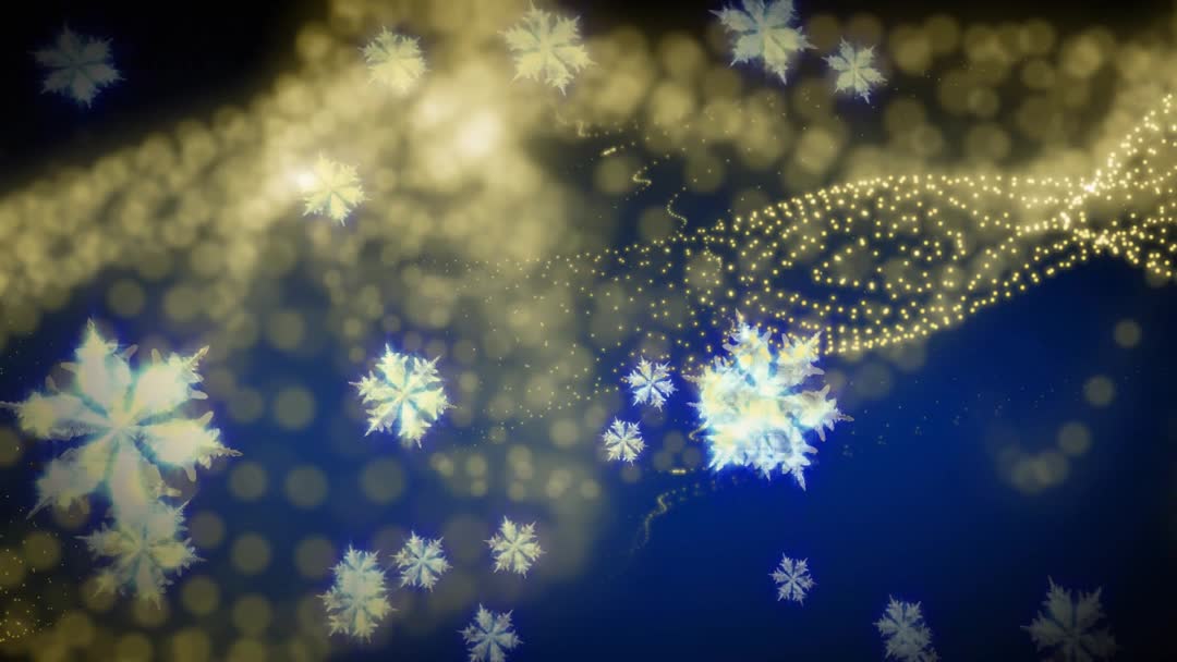 Video clip showing golden light ribbon sweeping across deep blue gradient while crystalline snowflakes drifting and rotating through soft bokeh glow. Particle stream and glittering points creating layered depth and cinematic motion ideal for seamless looping. Useful for holiday openers, seasonal greetings, social media reels, website headers, product promos, virtual event backgrounds, and digital signage. Easy to customize by placing logo or headline over dark center area, adjusting playback speed for dreamy slow motion or upbeat celebratory pace, and applying color grading to match brand palette.