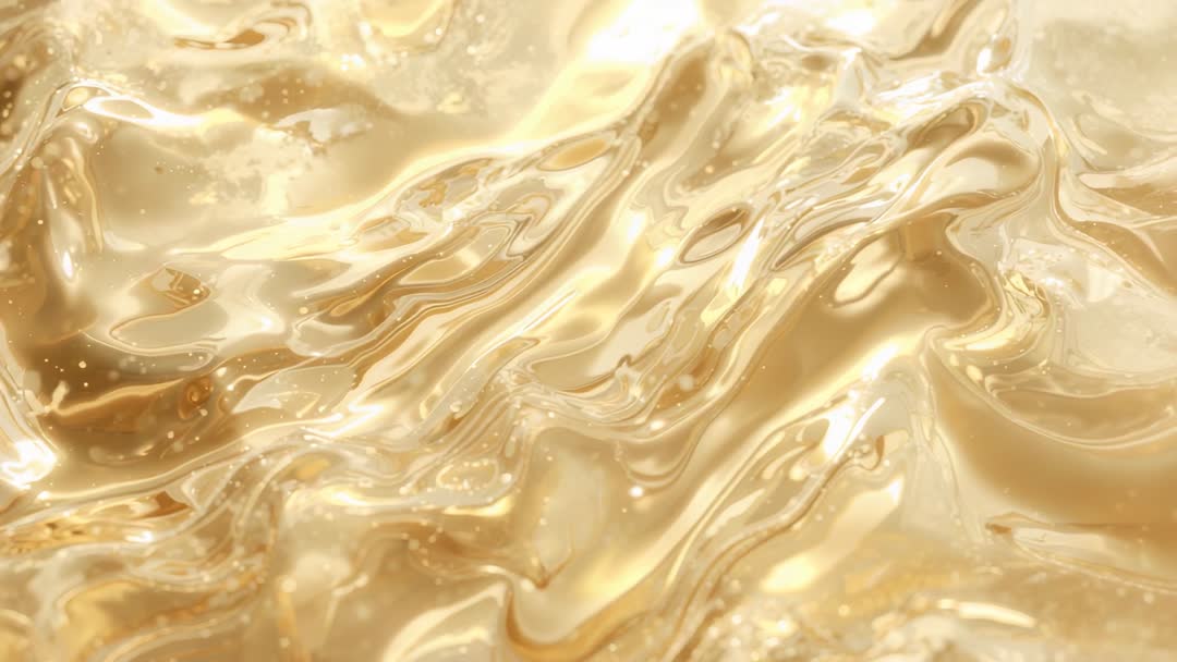AI Generated Image. Featuring close-up looping clip of flowing golden liquid with glossy ridges and shimmering highlights. CGI-rendering capturing reflective waves and micro sparkles, creating deep metallic depth and smooth motion. Offering loopable composition and high-detail texture, suiting luxury branding, title backgrounds, product promos, website hero video, social media ads, packaging animations, and event visuals. Allowing color grading and overlay text for custom brand treatments, motion graphic transitions, and decorative backdrops for presentations or displays.