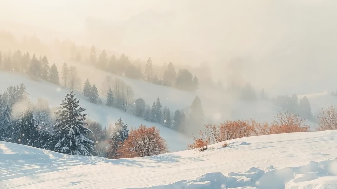 AI Generated Image. Cinematic clip showing gentle snowfall drifting across snow-covered hillside and layered misty pine forest, warm golden light filtering through fog and creating soft pastel tones. Foreground featuring frost-tipped shrubs with copper tones adding color contrast and depth. Slow camera movement or subtle parallax working well for hero backgrounds, opening titles, travel promos, seasonal greeting videos, mindfulness and wellness content. Suitable for web banners, social media reels, broadcast lower-thirds, nature documentary B-roll, tourism campaigns, winter product ads, and holiday branding. Suggest color grading to enhance warm highlights and cool shadows and adding soft ambient music with light snow sound for immersive atmosphere.