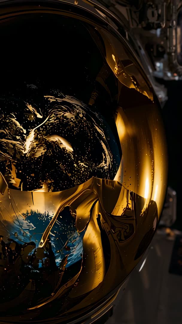 AI Generated Video. Showing golden orb with dark liquid swirling inside reflective metallic sphere under warm studio lights. Capturing close-up vertical motion with glossy droplets and complex machinery reflections. Offering cinematic abstract footage for tech, luxury, and sci fi projects. Working well as looped background for website headers, mobile app splash screens, and social vertical ads. Enhancing music video overlays, product launch teasers, and motion graphics with rich gold and deep blue tones. Serving as VFX reference plate, screen fill, or editorial visual for science and industrial stories. Including slow motion potential and tight crop for portrait format use.