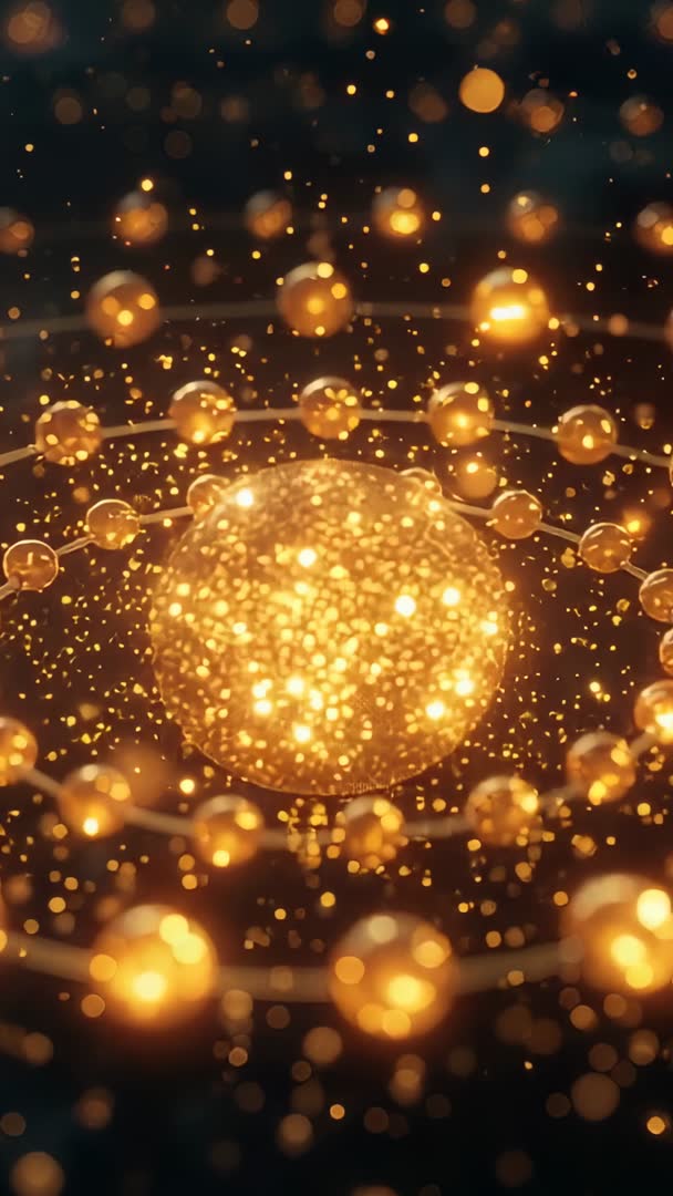 AI Generated Video. Video showing golden beads and particles orbiting and rotating around luminous central core in dark void. Camera keeping portrait orientation for mobile and social platforms. Particles pulsing and shimmering while rings slowly rotating, creating hypnotic bokeh and glitter effects. Clip offering seamless looping for short-form vertical playback. Serving mobile ads, social media stories and reels, title intros for tech or luxury brands, holiday or celebration promos, meditation and wellness visuals, background for product showcases and event screens. Pairing with soft ambient synths, chimes, or orchestral hits for cinematic impact. Providing color palette of amber, gold, deep black and warm highlights for cohesive branding. Delivering vertical 9:16 format, loopable edit, and 4K-ready resolution.