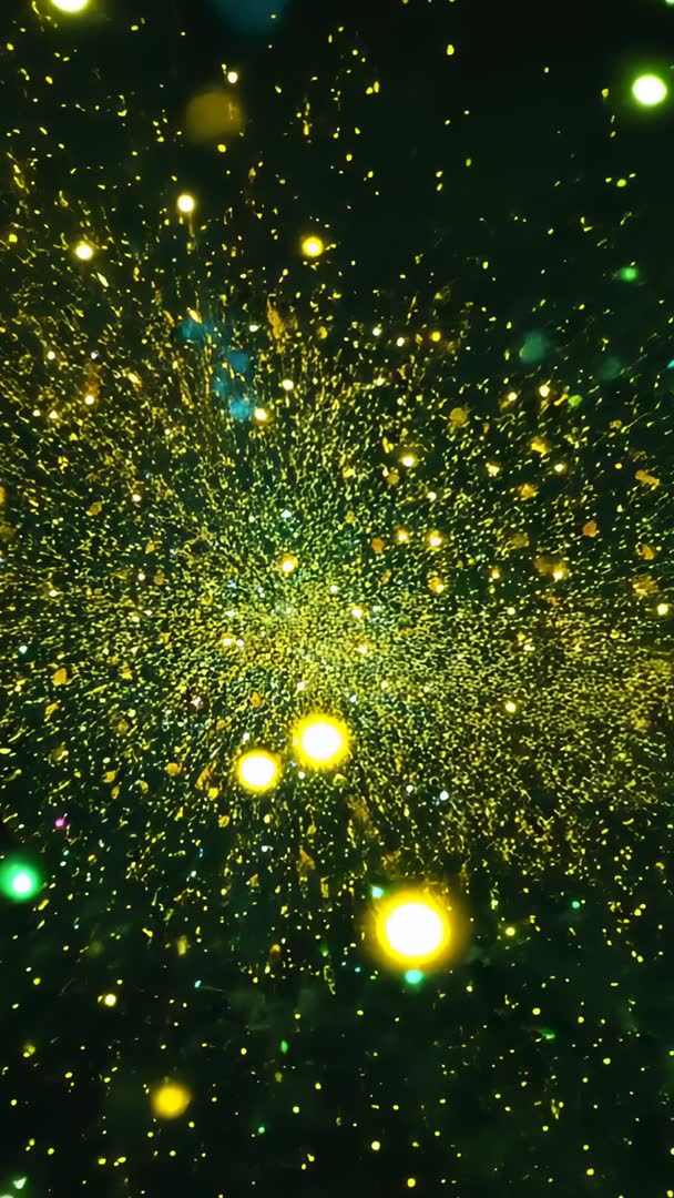 AI Generated Image. Radiating from central core, golden particles bursting outward into dark void and forming dense glitter cloud with scattered luminous orbs. Featuring bright yellow highlights and deep green undertones, creating dramatic contrast and immersive depth for vertical screens. Offering loopable motion and high-density particle flow, allowing seamless repetition for long-form projection, VJ sets, or social media reels. Serving as cinematic backdrop for event promos, music visuals, title intros, party flyers, and holiday or celebration content. Providing flexible source for color grading, speed adjustment, and overlaying text or logos for mobile ads, story formats, and phone wallpapers.