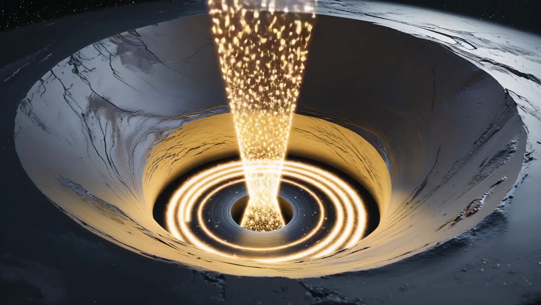 AI Generated Image. This captivating video depicts a stream of golden particles elegantly cascading into a crater-like funnel in deep space, forming glowing portal rings. It combines elements of science fiction and cosmic wonder, making it ideal for use in futuristic storyboards, album covers, or digital projects that explore outer space themes. Its intricate design and vibrant colors can inspire creativity or enhance visual aesthetics in various multimedia channels.