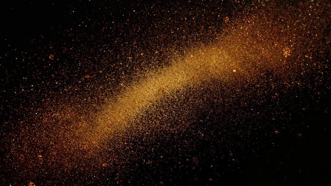 AI Generated Image. Showing golden powder exploding into sweeping curved arc against black backdrop, video clip captures fine shimmering particles and reflective glitter flying in cinematic motion. Closeup slow motion capture emphasizing texture, depth and warm amber tones. High-contrast dark backdrop creating dramatic visual focus and smooth negative space for overlays. Use for luxury product reveal, cosmetic and jewelry advertising, champagne and beverage campaigns, holiday and New Year promotions, cinematic title intros, social media ads, website hero banners, motion graphics backgrounds, VJ loops and event visuals. Use as transition element in broadcast opener or music video, or as layered texture for compositing and VFX. Suitable for editorial designs, advertising, packaging and branding projects seeking elegant, celebratory or premium mood.
