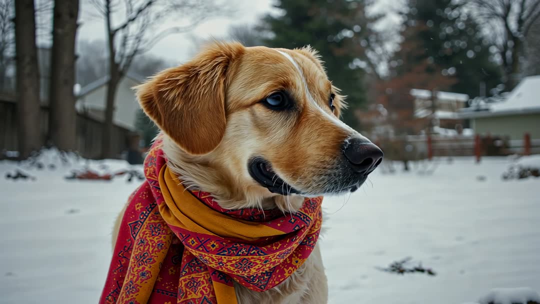 - Golden Retriever in Colorful Scarf Exploring Winter Yard