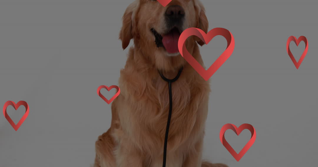 Adorable golden retriever surrounded by heart overlays, evokes feelings of love and companionship. Perfect for promoting pet adoption, veterinary care, or conveying affection and warmth in advertisements. Suitable for social media content highlighting positive emotions associated with pet ownership.