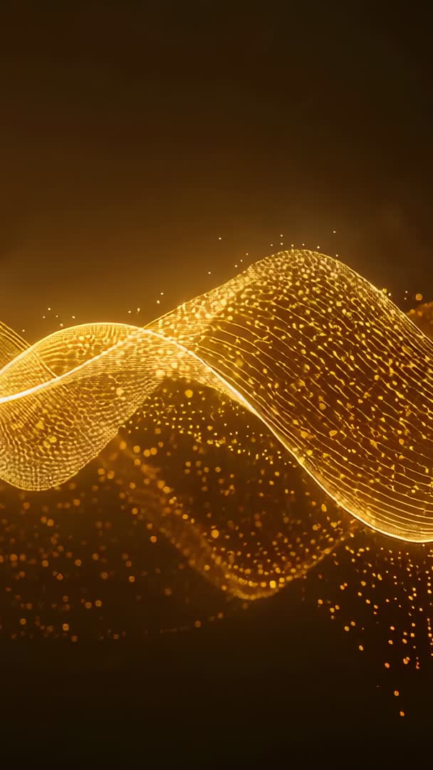 AI Generated Video. Vertical motion graphic showing golden ribbon of light undulating across dark amber backdrop with drifting sparks and glowing particle bokeh. Fitting mobile and social formats, 9:16 aspect ratio optimized for stories, reels, mobile hero sections, and vertical displays. Loop-friendly clip providing smooth transitions for title cards, logo intros, product reveals, and event promos. Color palette offering warm golden tones and deep amber gradient, ideal for luxury branding, holiday campaigns, concert visuals, and meditation apps. Allowing text overlays, logo animations, and sound design to create atmospheric openers for digital advertising, presentations, and stage backdrops.