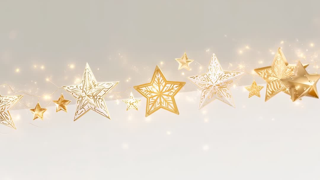 AI Generated Video. Featuring gold ornamental five-point stars drifting across soft neutral gradient with warm bokeh sparkles and subtle shimmer. Designed as seamless looping animation for use as background in holiday campaigns, seasonal web banners, social media reels, TV promos, virtual event backdrops, and greeting card intros. Providing wide horizontal composition and clean negative space for text or logos. Working well with serif or script typography, warm color palettes, and overlaying lower-third graphics. Suggesting export as loopable MP4 or animated GIF, adjusting brightness to maintain text legibility, and using gentle crossfade for scene transitions. Ideal for luxury product ads, festive email headers, event invitations, end-screen visuals, and retail window displays.