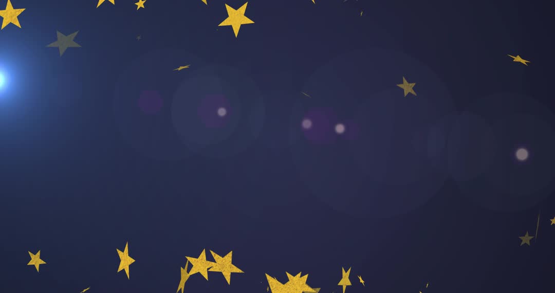 Featuring left lens-flare burst sending golden stars falling, rotating, clustering then dispersing across deep navy gradient with soft bokeh highlights. Loopable short clip with smooth motion and gentle glow creating cinematic atmosphere. Providing ample negative space at center for overlaying text, logos, or lower-thirds. Perfect for holiday promotions, event openers, celebration intros, social media reels, website hero backgrounds, broadcast lower-thirds, and motion graphics projects. Working well as overlay element when combined with color grading, particle blur, or vignette. Available in loop-ready high-resolution formats suitable for 4K timelines and video editors. Color palette featuring deep navy and metallic gold providing elegant, festive mood. Suggested usage: opening title, end card, promotional ad, festive greeting, background plate, animated banner, and lower-third animation.