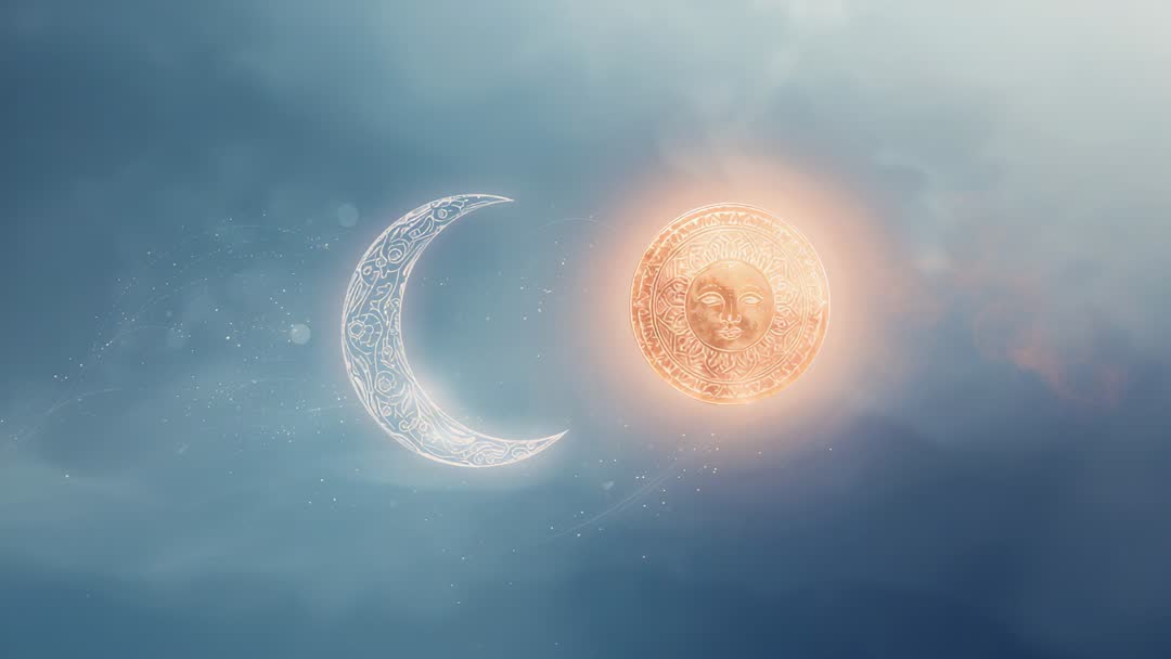 AI Generated Image. Short ambient video showing pulsing golden sun disk with ornate filigree face and shimmering silver crescent moon drifting through misty blue sky. Gentle particle motes and soft halo glow creating ethereal, mystical mood for relaxation, wellness, and seasonal projects. Ideal for meditation app backgrounds, spiritual blog headers, festival projection visuals, event visuals, social media reels, website hero banners, and title sequences. Clip working well as looped background, transitional overlay, or animated illustration for astrology, tarot, or celestial branding. Color palette combining cool silver tones and warm gold highlights, easy to color grade and composite into larger motion design.