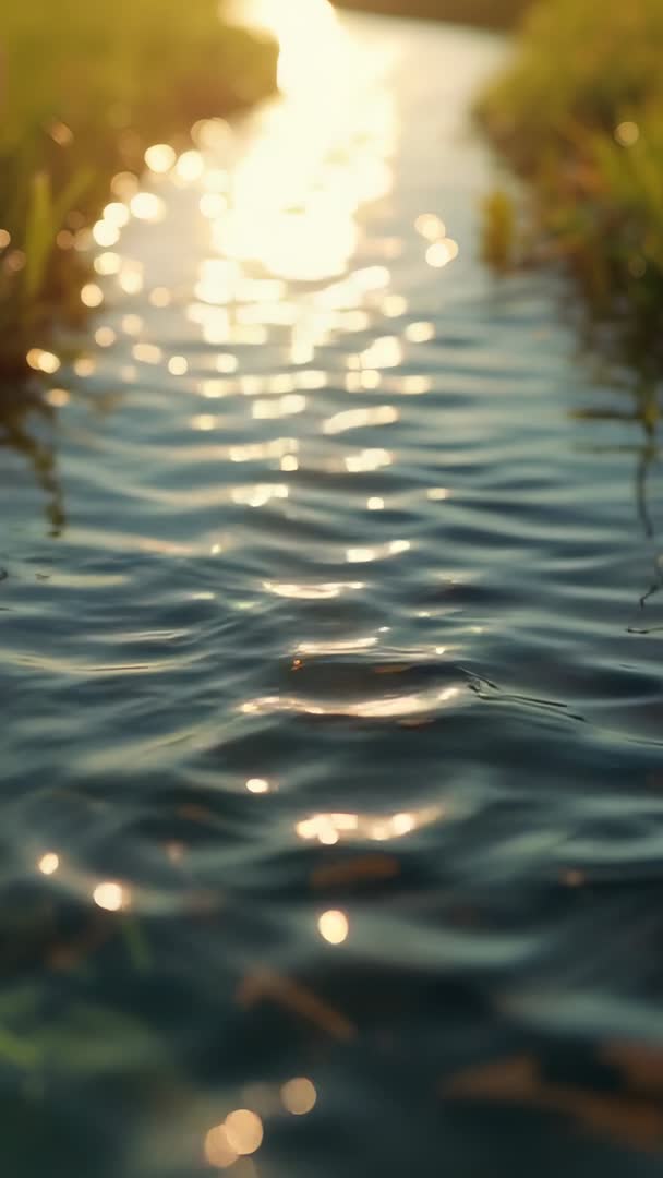 AI Generated Image. Vertical video showing sun glinting on rippling meadow stream during golden hour, with grassy banks framing gentle current. Featuring shallow depth of field and soft bokeh highlights for cinematic, dreamy mood. Close-up composition capturing fluid motion and reflective highlights, offering warm golden tones and tranquil atmosphere. Suited for wellness and relaxation content, social media reels, mindfulness app backgrounds, travel and nature montages, and commercial advertising. Working well as looping background for website hero sections, digital signage, on-hold video, and meditation or spa videos, pairing with ambient piano or nature soundscape to enhance calming effect.