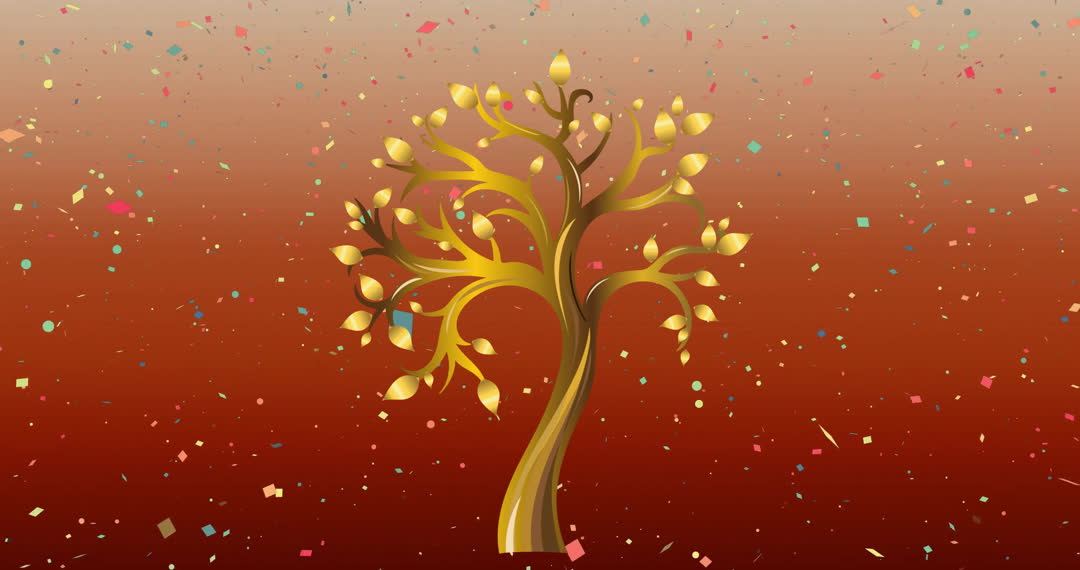 An illustration featuring a stylized golden tree set against a shimmering red background enhanced with multicolored confetti in the air. This digital scene embodies themes of celebration, growth, and prosperity, implying festive or ceremonial elements. Perfect for use in digital greetings, festive website backgrounds, promotional graphics for celebrations, or themed presentations reflecting abundance or growth.
