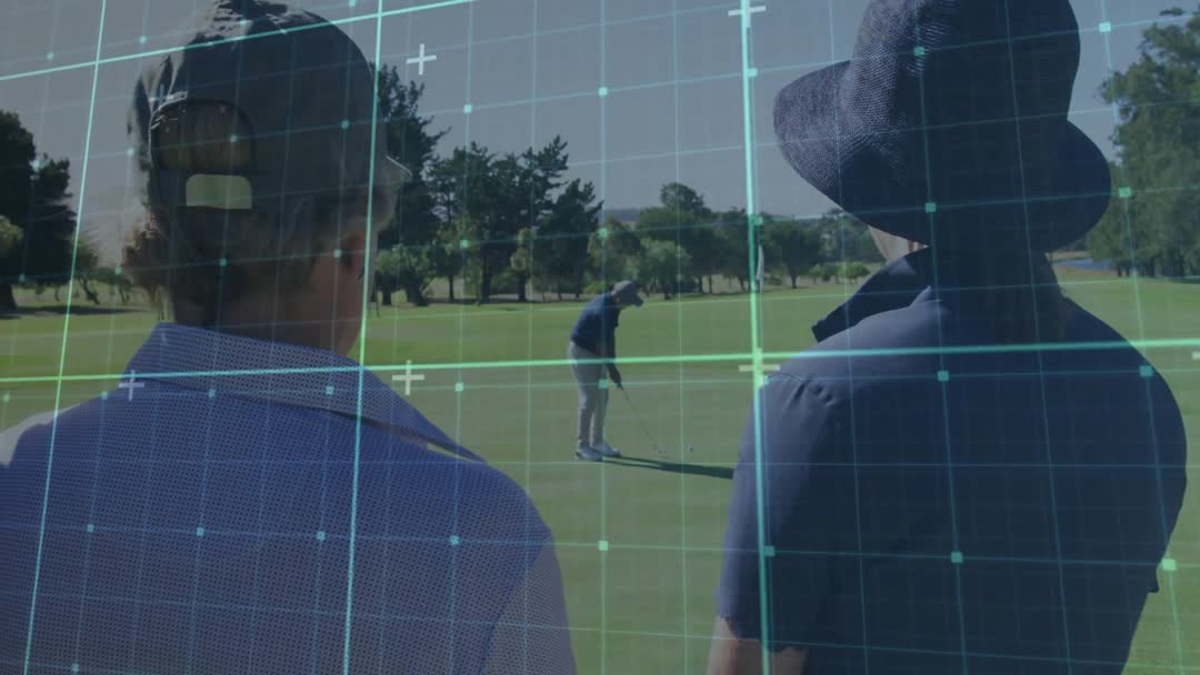 An advanced grid overlay appears as spectators analyze a golfer preparing to putt. The scene illustrates modern applications of technology in sports. Ideal for use in promoting technology in sports, coaching tools, and leisure activities that focus on precision and technical improvement.