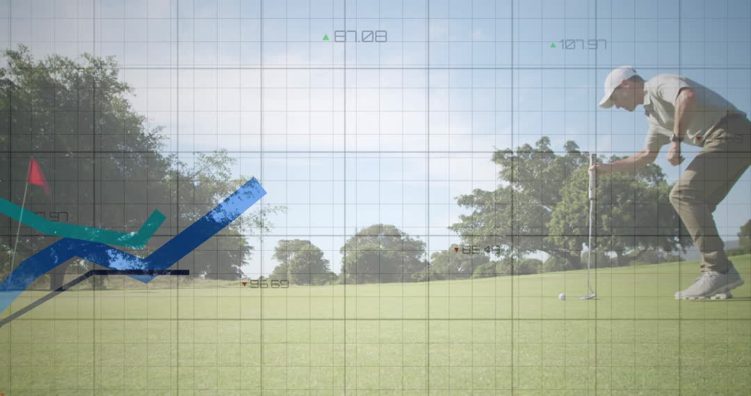 Golfer carefully inspecting putt, with advanced data graphs illustrating course slope and analytics overlaying video. This visual represents integration of technology and sports, combining traditional game insights and modern data-driven tactics. Perfect for use in features on golf analytics, innovations in sports performance, marketing technology integrations in athletics, or outdoor sports events. Highlights harmonious blend of physical gameplay and digital insights.