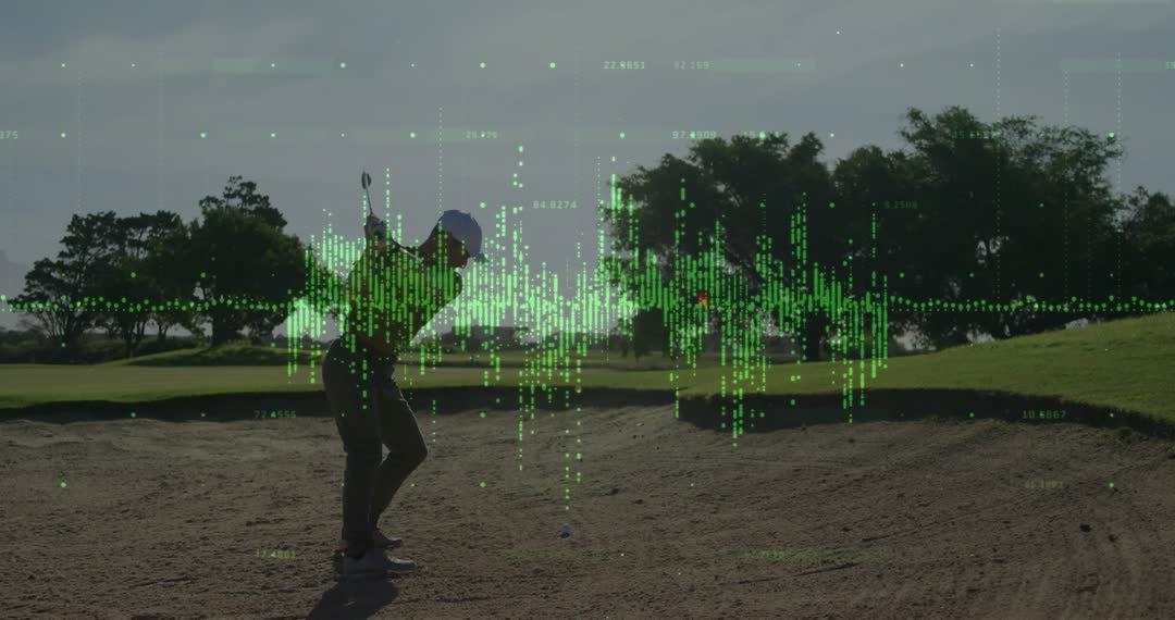 This visual captures a golfer in a sand bunker poised to swing, enhanced by a virtual tech overlay depicting arc and ball trajectory. Ideal for use in content relating to golf training and techniques as well as articles on sports technology innovations. Useful for presenting advanced athletic skill examination and offering insights into precision and performance analysis for educational videos or sports documentaries.